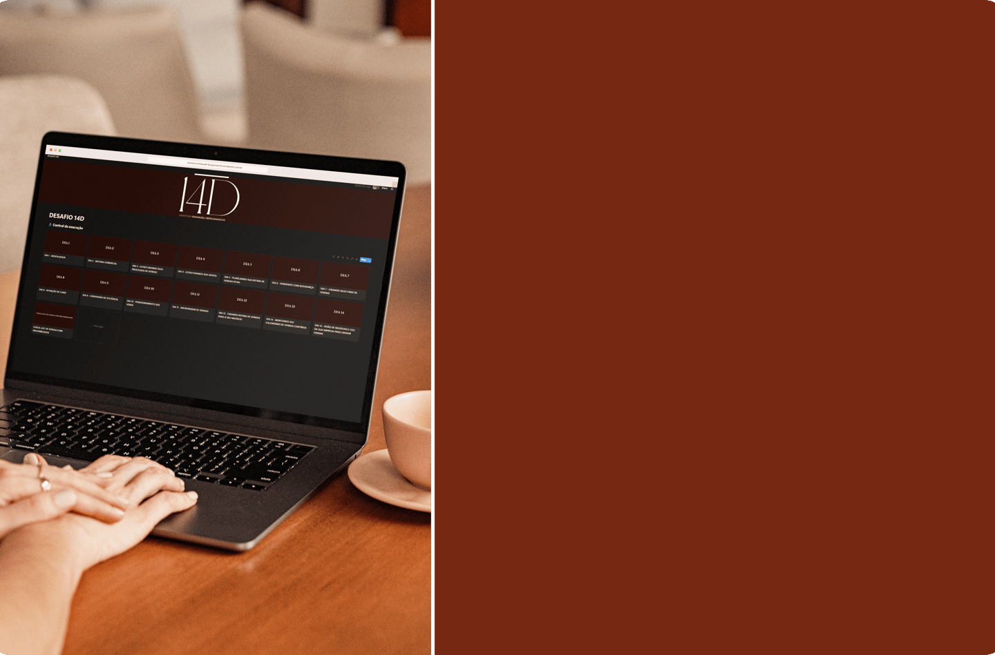 São 14 dias de execução obrigatória, onde você aprende e coloca em prática como vender seu serviço como nutricionista com quem já faz isso há mais de 15 anos.