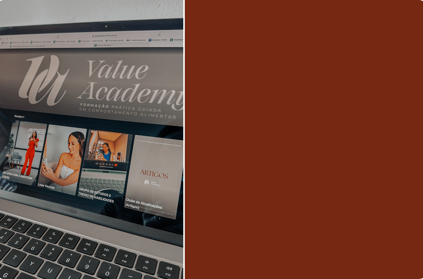 A Value Academy é a Netflix do Comportamento Alimentar — um produto completo, criado pela mentora Emanueli, uma das únicas nutricionistas do RS certificada pelo Instituto Pioneiro de Nutrição Comportamental.